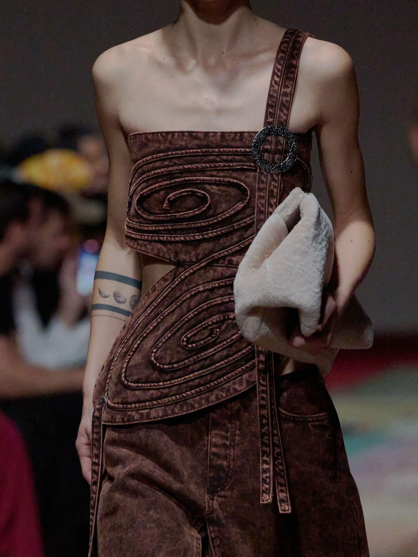 • Skygazer-inspired 3D spiral-shaped acid-washed denim top with carpet-embossed metal ring on the double strap